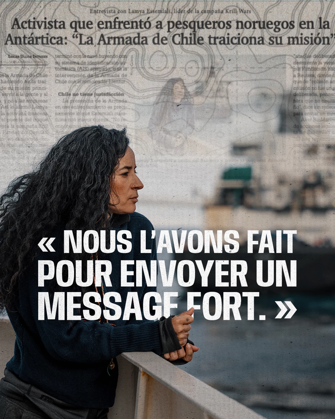 C'est ce qu'a déclaré Lamya Essemlali, la militante française qui, depuis le pont du navire Bandero, dirige la campagne « Krill Wars » de l’ONG Sea Shepherd France, lors d'un entretien avec La Prensa Austral, le seul média chilien auquel elle s'est confiée au sujet de l'affrontement du 4 avril dans le détroit de Bransfield.