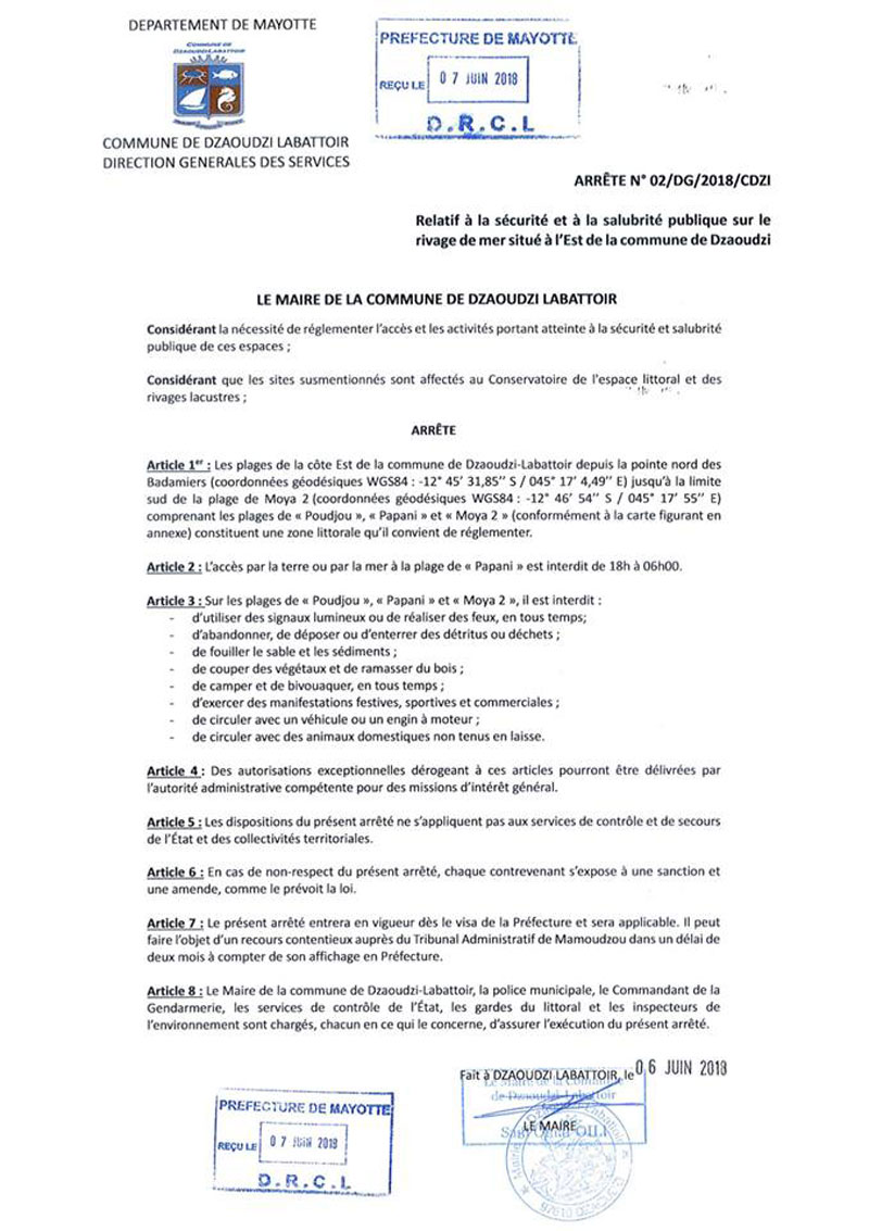 Nous savons que ce braconnier va revenir, les autorités sont au fait de la situation et leur réponse à été de faire passer un arrêté municipal* qui interdit de se rendre sur Papani entre 18h et 6heures du matin sous peine d'amende en raison de l'isolement de la plage à marée haute et de la présence importante de braconniers. Les tortues marines, espèces menacées, essentielles à la survie du lagon mahorais sont donc abandonnées à leurs bourreaux et les autorités ne s'en cachent même plus.
