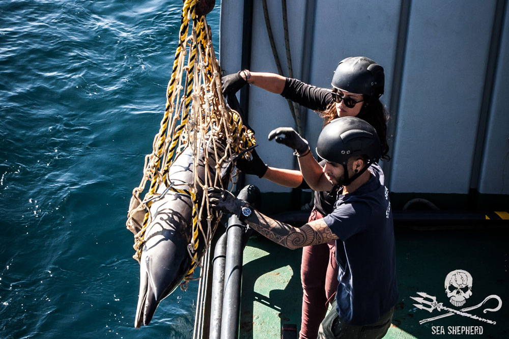 Après avoir suivi le Natif 2 et La Roumasse pendant quelques heures sans que ces derniers ne rejettent le dauphin à l'eau, le navire de Sea Shepherd a croisé le corps flottant d'un dauphin plus petit, portant des traces de filets et de crochet. "Nous avons décidé de ramener ce dauphin à terre et de l'exposer aux yeux des passants pour les alerter sur ce qui se passe en mer" déclare Lamya Essemlali, Présidente de Sea Shepherd France. Le dauphin a été pris en charge par l'Observatoire scientifique Pélagis afin d'être autopsié aujourd'hui.