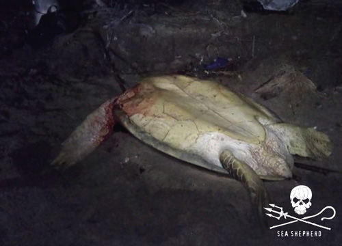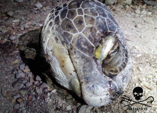 Plusieurs tortues ont été tuées à la machette alors qu’elles venaient pondre sur la plage de leur naissance. Les volontaires en patrouille ayant interrompu les braconniers, ceux ci ont pris la fuite en laissant sur place machette, couteaux et une tortue égorgée agonisante qui a connu une mort lente et douloureuse.