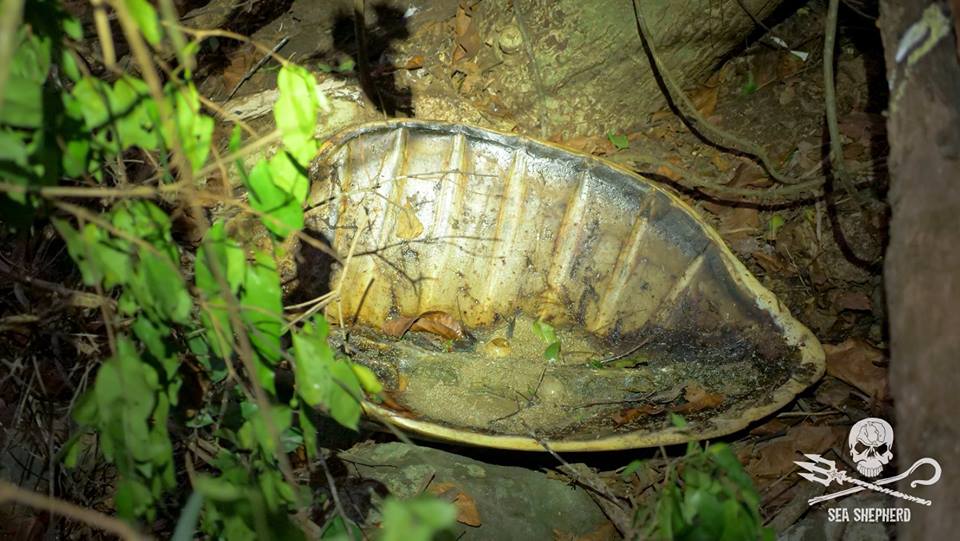 Avant leurs patrouilles, ils ont inspecté les plages, comme d'habitude, et on fait une triste découverte : 2 carcasses de tortues récemment braconnées, de la viande, des traces de sang et des œufs. Il est fort probable que 4 tortues aient été braconnées la nuit précédente, notre équipe ayant découvert les traces de montée de deux autres tortues qui ont probablement été retournées sur leur carapace, ramenées sur un bateau et tuées en mer pour laisser moins de preuves de cet acte cruel et illégal.