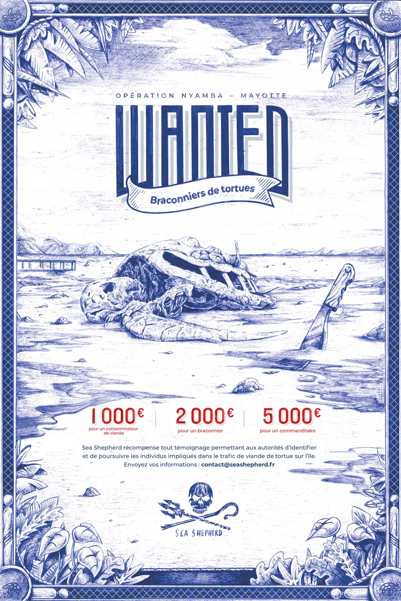 Leur chair se vend à prix d'or au marché noir et les braconniers ne sont quasiment jamais appréhendés. Afin de délier les langues, Sea Shepherd lance une récompense qui sera versée pour toute information permettant aux autorités de poursuivre les coupables : 5000 euros pour ceux qui commanditent le braconnage, 2000 euros pour ceux qui tuent les tortues sur les plages et 1000 euros pour ceux qui consomment leur chair.