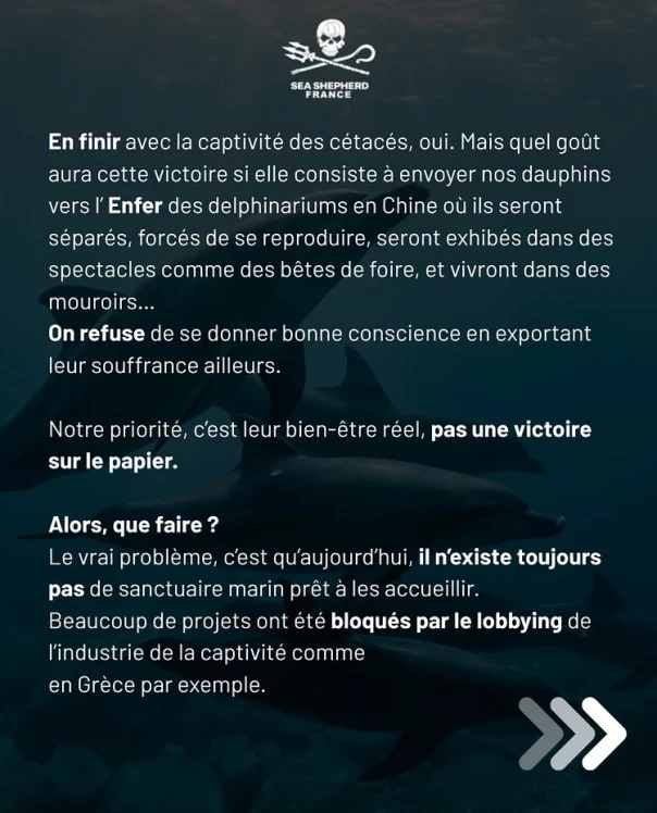 En finir avec la captivité des cétacés, oui. Mais quel goût aura cette victoire si elle consiste à envoyer nos dauphins vers l’enfer des delphinariums en Chine où ils seront séparés, forcés de se reproduire, seront exhibés dans des spectacles comme des bêtes de foire, et vivront dans des mouroirs…