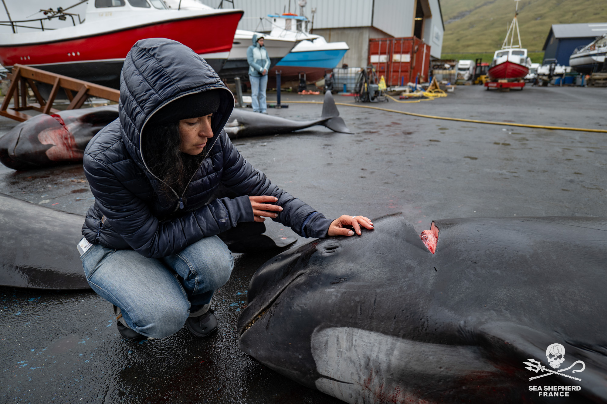Les gars finissent par le laisser, vont vers d'autres dauphins mais celui-ci est toujours vivant, je leur hurle de revenir abréger ses souffrances. Une petite fille d'environ 8 ans est aux premières loges, elle se retourne surprise quand elle m'entend hurler. J'ai beau regarder ailleurs, je ne vois que le corps déchiqueté de ce dauphin qui s'accroche à la vie, qui continue de souffler bruyamment par l'évent alors même qu'il est quasiment découpé en deux... Il est mort à présent, mais son agonie s'est imprimée sur ma rétine. Le grindforman (chef de chasse) vient me dire de dégager, il n’apprécie pas que j’aie passé le cordon de sécurité alors qu'il me l'avait interdit, et encore moins que je hurle sur son équipe de bouchers amateurs qui charcutent un dauphin sans même être capables de l'achever.
