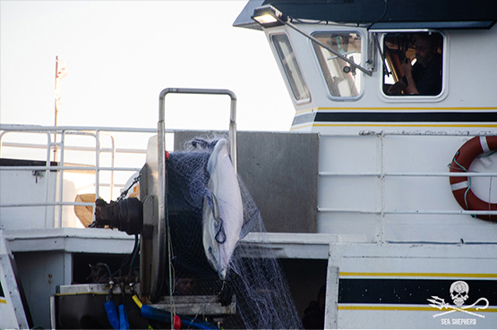 Malgré cette difficulté, au petit matin du 30 Août dernier, une équipe de Sea Shepherd a pu filmer le Voluntas Dei, un fileyeur « artisanal » de 16 mètres immatriculé à Arcachon en train de relever ses filets. Au premier relevé deux dauphins morts sont remontés. Le Voluntas Dei a ensuite posé ses filets un peu plus loin pour les relever avec deux autres dauphins. Le lendemain, un cinquième dauphin capturé est relevé dans le filet. A son arrivée au port du Guilvinec, la gendarmerie maritime prévenue par Sea Shepherd a inspecté le navire. Le Voluntas Dei avait déclaré la capture de 4 dauphins ( le 5ème reste à confirmer). Dans les faits, en 2019, sur 11 300 dauphins tués, seules 4 déclarations ont été effectuées. On est donc en droit de soupçonner que le Voluntas Dei n’a procédé aux déclarations que parce que les captures ont été filmées par Sea Shepherd.
