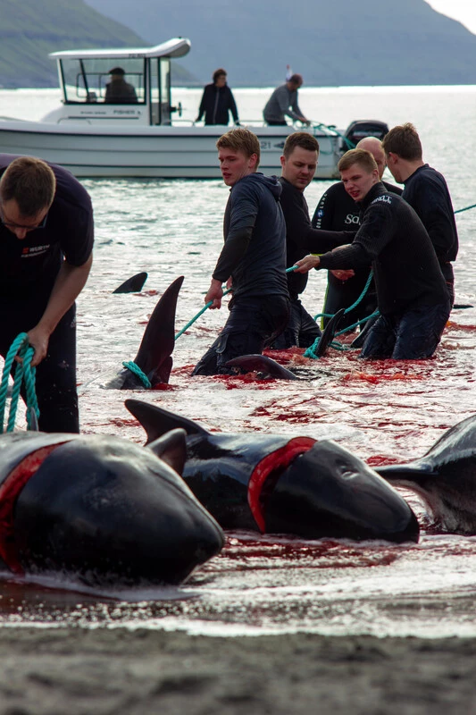 Et pourtant, cette semaine aux îles Féroé, on l’a filmé remorquant les corps de plus de 100 dauphins globicéphales massacrés pendant un grindadráp.