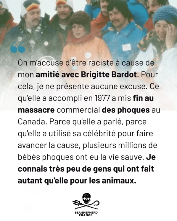 Et bien sûr, on m’accuse d’être raciste à cause de mon amitié avec Brigitte Bardot. Pour cela, je ne présente aucune excuse. Ce que Brigitte Bardot a accompli en 1977 mit fin au massacre commercial des phoques au Canada. Parce qu’elle a parlé, parce qu’elle a utilisé sa célébrité pour faire avancer la cause, plusieurs millions de bébés phoques ont eu la vie sauve et le marché des produits en peau de phoque s’est effondré dans de nombreux pays, y compris dans toute l’Europe. Je connais très peu de gens qui ont accompli autant pour les animaux qu’elle.