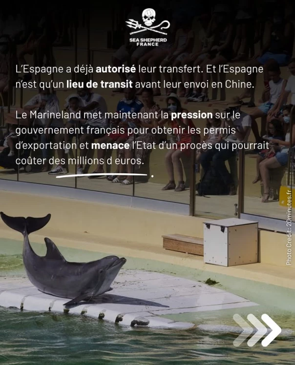 L’Espagne a déjà autorisé leur transfert. Et l’Espagne n’est qu’un lieu de transit avant leur envoi en Chine. Le Marineland d’Antibes met maintenant la pression sur le gouvernement français pour obtenir les permis d’exportation et menace l’État d’un procès qui pourrait coûter des millions d’euros. Si ces permis sont signés, même un recours en justice (que nous ne manquerons pas de lancer) n’y changera rien.